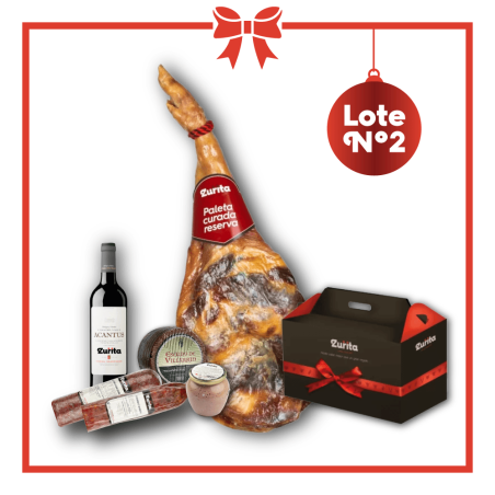 Paleta curada Zurita de 4,5 a 5kg; media tripa de salchichón de pueblo Zurita de 550g, media tripa de chorizo de pueblo Zurita de 550g, paté de cerdo casero con jamón ibérico 500 g, queso mezcla semicurado Escudo de Villarrín 900g y botella de vino tinto Acantus 75cl.