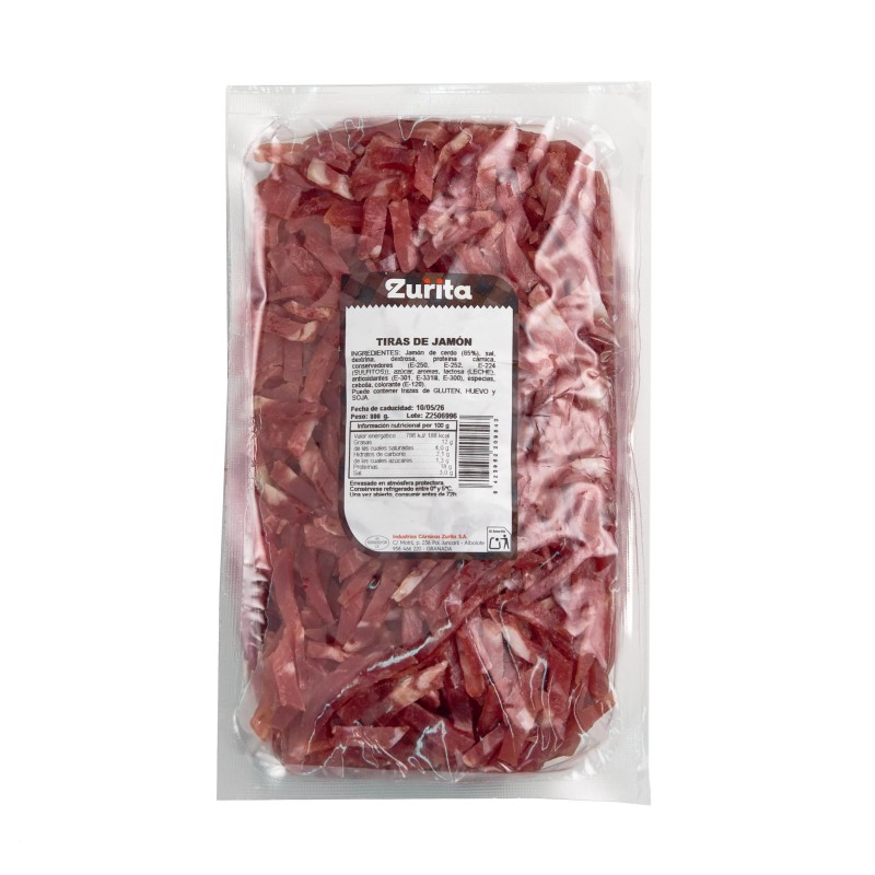 Disfruta de 800 g de deliciosas tiras de jamón envasadas en atmósfera protectora, listas para consumirlas. Una opción ideal para incorporar el auténtico sabor del jamón Zurita en tus comidas diarias.